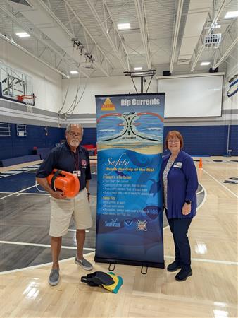 Spring Lake-Brielle Rotary Club member Ace Aljian Spoke to students at Manasquan Elementary School about how to stay safe in the water at the beach. Rotary member Jodi Quercia joined in the presentation.